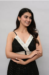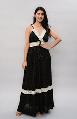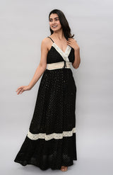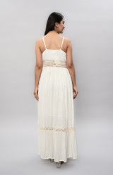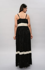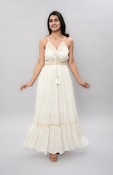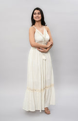 A breezy silhouette adorned with tiny golden dots and delicate lace inserts, this ivory dress is all about soft details and graceful structure. The gathered waist, adjustable straps, and tassel-tie front make it an easygoing yet polished pick for any warm-weather occasion.