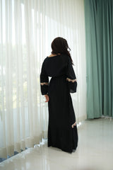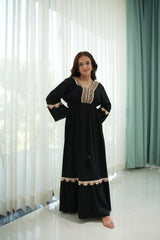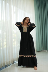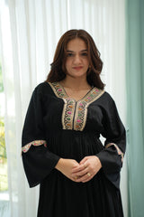 A bold black silhouette brought to life with multicolor lace detailing along the neckline, sleeves, and hem. This full-length rayon dress features an empire waist, flared sleeves, and a tasseled drawstring for a subtle cinch. The delicate contrast of pastel embroidery against deep black adds a soft folk-inspired charm—perfect for festive evenings or relaxed daytime flair.