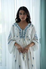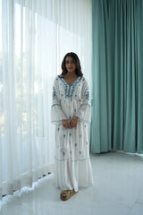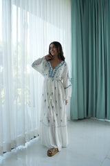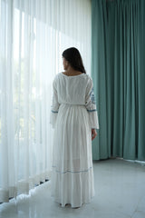 A serene ivory canvas brought to life with rich blue threadwork, this rayon long dress features hand-done embroidery along the neckline, sleeves, and panels. Finished with soft cotton ladder lace detailing and a gentle flare, it offers a graceful silhouette that flatters with ease. Whether you're unwinding at home or stepping out for a mellow afternoon, itβs comfort with quiet detail.