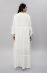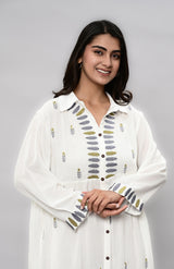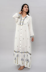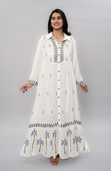 A breezy buttondown with intricate threadwork, this piece features delicate leafy motifs and bold palm tree embroidery at the hem. With a relaxed fit, collared neckline, and soft gathers, it’s perfect for effortless day dressing.