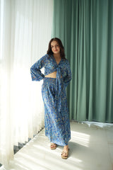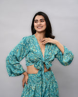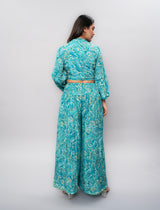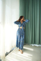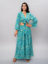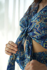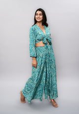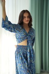 A breezy two-piece set in striking teal, printed in swirling paisley patterns. The knotted front top with full sleeves pairs effortlessly with flared palazzo pants, trimmed with a geometric border—perfect for brunches, beach strolls, or laid-back lounging with style.