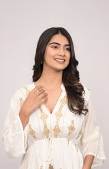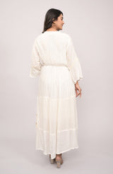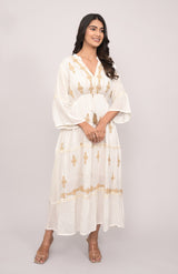 Crafted in breezy rayon lurex, the Ivory Gold Noor Dress channels understated charm with a touch of shimmer. The warm ivory base is adorned with intricate golden embroidery, set in a symmetrical flow from neckline to hem. The flared sleeves, tasseled tie-up at the waist, and sequin-detailed panels bring an effortless bohemian ease to this silhouette—perfect for everything from summer brunches to festive evenings.