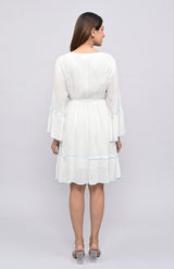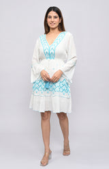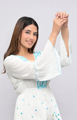 This easy-breezy tunic brings together charm and comfort in equal measure. Made in soft rayon lurex, the Ivory Dusk Embroidered Tunic features delicate white-on-white thread embroidery with intricate paisley and floral cutwork. Its flared silhouette, gathered waistline, and bell sleeves offer a playful, feminine vibe—perfect for vacation days, city strolls, or brunch under the sun.