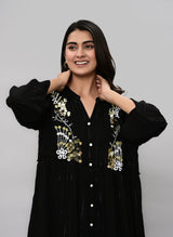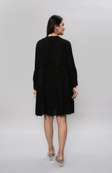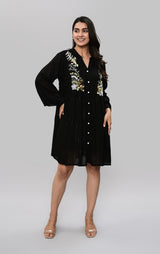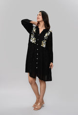 A relaxed silhouette that flows with grace, this black lurex dress is detailed with delicate hand embroidery and sequin work that catches the light just right. The button-down front and flared sleeves make it perfect for casual outings or evenings that call for just a touch of drama.